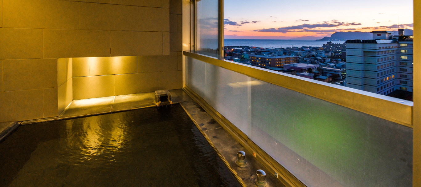 湯の川温泉で最も高い場所に位置する最上階の展望露天風呂。目の前を遮るものが何もないその空間で、